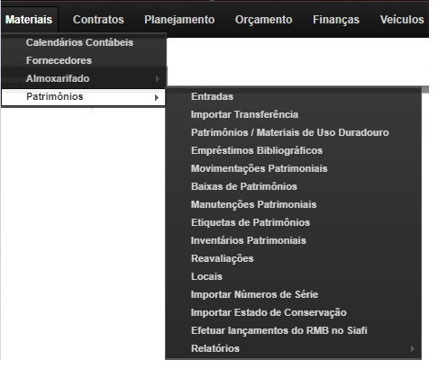 O módulo Patrimônio está disponibilizado no menu superior “Materiais”. Dentro desse menu existem três opções: Fornecedores, Almoxarifado e Patrimônio, sendo que neste manual serão abordadas a primeira e a última. A primeira delas – Fornecedores – é utilizada tanto para cadastramento de fornecedores de Almoxarifado, quanto para àqueles de Patrimônio.