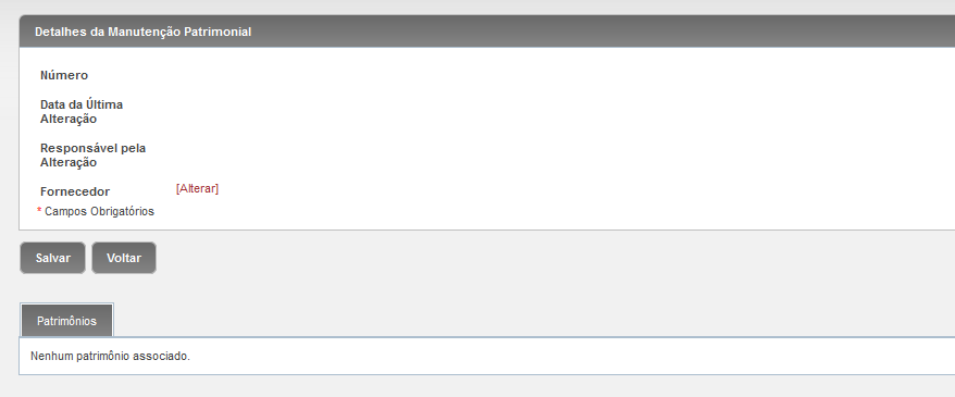 Para acessar: Materiais >> Patrimônio >> Manutenções Patrimoniais >> Cadastrar Manutenção Patrimonial
