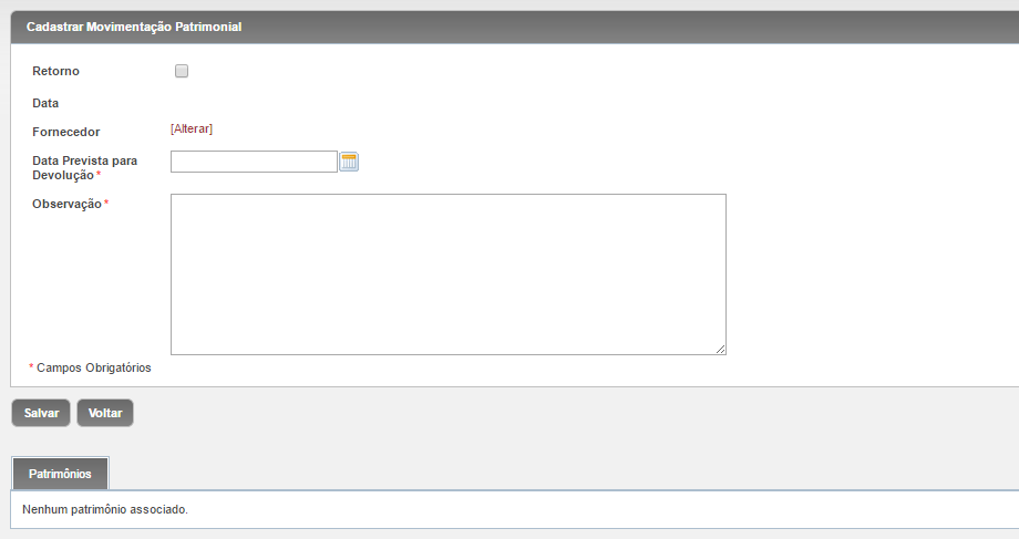 1º) Preencher os campos existentes, informando se é retorno de bem anteriormente movimentado externamente, fornecedor, data prevista para devolução (se não for retorno), observação (descrição da movimentação) e >> Salvar.