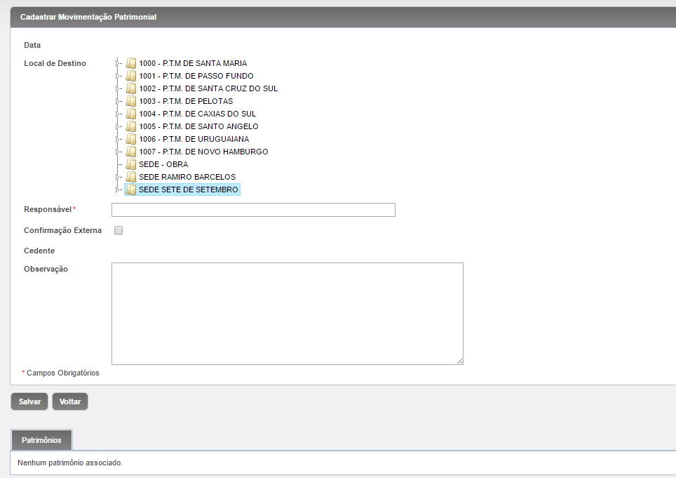 Para acessar: Materiais >> Patrimônio >> Movimentações Patrimoniais >> Cadastrar Movimentação Patrimonial Interna
