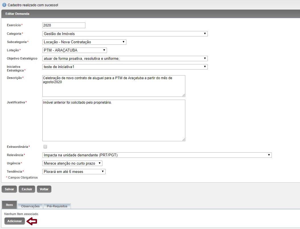 - Todas as demandas devem conter um ou mais itens de aquisição, contratação ou ambos para que o sistema permita que sejam enviadas para deliberação;