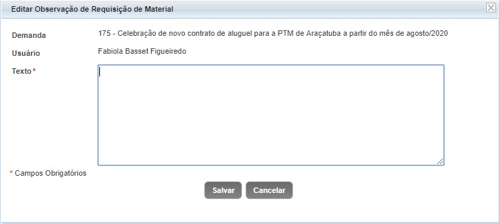 - Observações: preenchimento não obrigatório. Aba onde o requisitante informa o que julgar pertinente sobre a demanda e >>Salvar.
