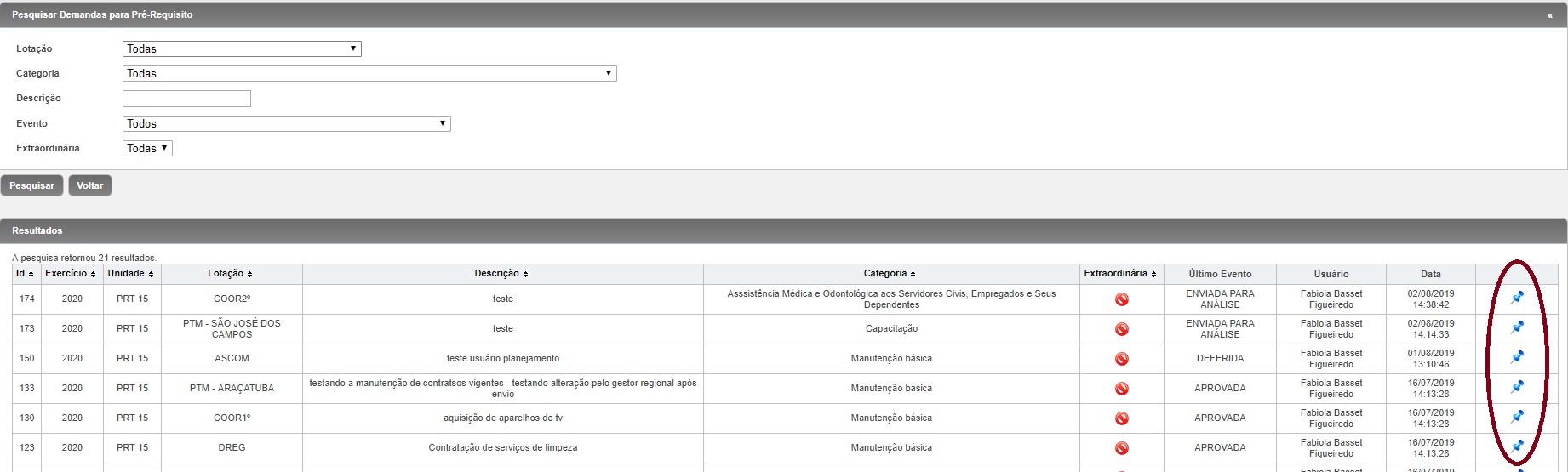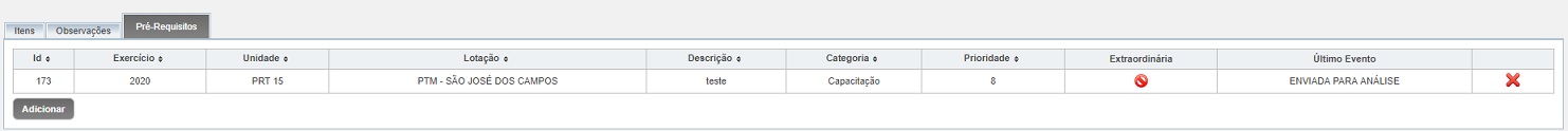 . Preenchimento não obrigatório (exceto se houver pré-requisito). É nessa aba que o requisitante informa a existência de alguma outra demanda já cadastrada que seja pré-requisito da demanda ora em cadastramento. Exemplificando: determinada unidade regional pretende adquirir e instalar aparelhos de ar condicionado no imóvel sede. Para tanto, cadastrará uma demanda contendo dois itens: aquisição de ar condicionado e instalação dos aparelhos. Ocorre que, a rede elétrica do imóvel encontra-se bastante antiga e subdimensionada, apresentando constantes problemas de queda de disjuntor, queima de equipamentos etc, tornando necessária a realização de sua revisão e adequação. Verifica-se, assim, que, sem essa melhoria na rede elétrica, tendo em vista que o imóvel não comporta as voltagens envolvidas, não será possível a instalação de novos aparelhos condicionadores. Pois bem, a demanda da revisão da parte elétrica é pré-requisito para a demanda de aquisição e instalação de aparelhos de ar condicionado, vinculação essa que deve ser informada por meio desta funcionalidade, para que, no momento de liberação de verba, ocorra primeiro aquela relativa ao pré-requisito.