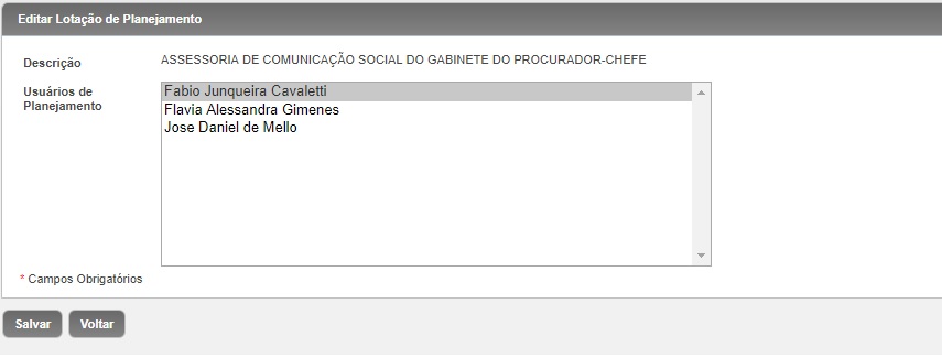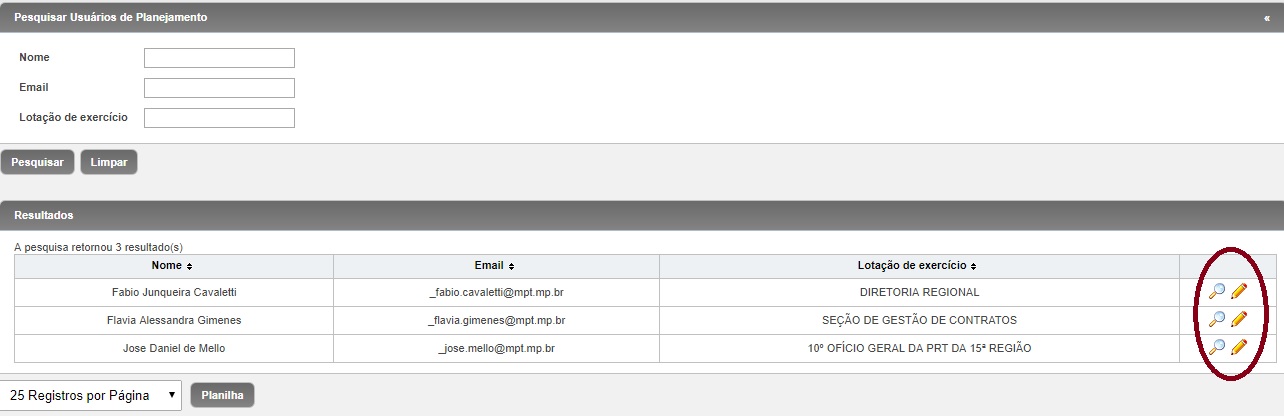 Importante lembrar que o rol disponibilizado reflete os nomes dos servidores aos quais foi atribuído, no âmbito da unidade, o perfil de Usuário Regional do Planejamento, conforme chamado no