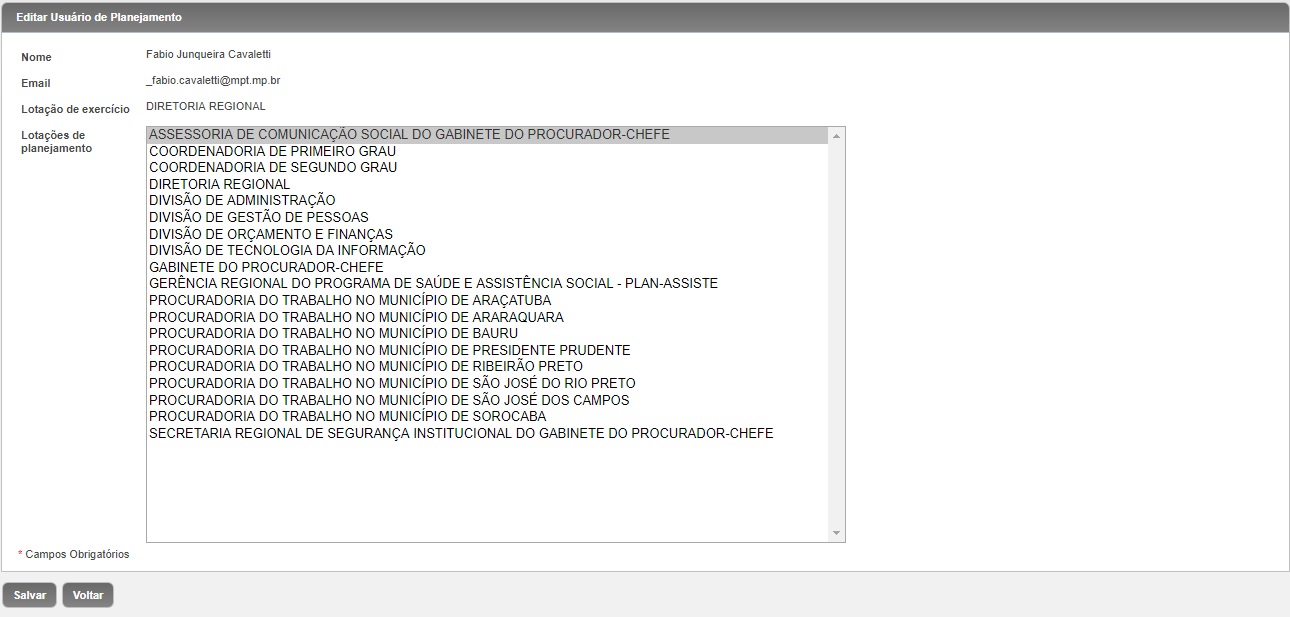 Os servidores que receberam o perfil de Usuário Regional do Planejamento poderão ser vinculados a uma, algumas ou todas as lotações disponíveis naquela Unidade Gestora para que cadastrem demandas afetas àquele segmento administrativo ou PTM.